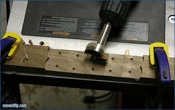 Here I am milling out a space for the circuit board to fit using a forstner bit and a hand drill. This would have been much easier and more precise with a drill press, but I didn't have one at the time.