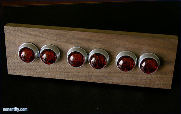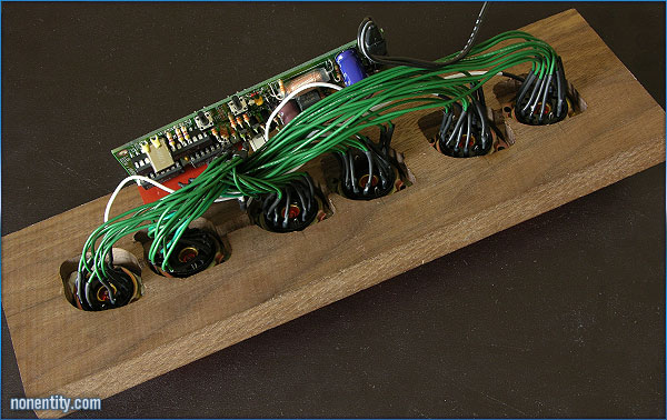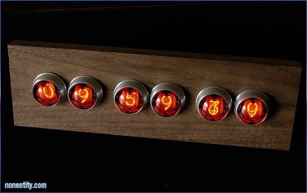 I had to hand wire all these connections from the leads on the back of the tubes back to the homemade plug that fits into the side of the circuit board. I had to measure, crimp, and keep track of over 60 connections from the circuit board to the tubes. 2006-07-07 - IT WORKS!! I tested the outputs with the multimeter, set the power from 240volts down to 175, which is in the operating range of the Z560Ms. I got half my cathode connectors wired up with some help from some parts from Fry's. I plugged in half my tubes, and they count the time! Can't wait to plug in the rest of the tubes. I have to fix one part of my walnut board where the milling machine got loose and drilled too deep, but it's close to being finished. 2006-07-03 - Finally finished assembling the clock board. Now I have to make the tube connectors. I also finished milling out my walnut plank so the sockets I got from Hungary will fit. 2006-06-27 - My Clock Board kit from Germany arrives today. Can't wait to get it put together. I will have to solder all the components and make the connectors, as I didn't buy the tube board. I am spacing my tubes out wider than their tube board allows. 2006-03-27 - Greg Beaman finished my tube bezel copies for my Z560Ms. Excellent work! May 4, 2006 - My 10 z560M sockets and tubes arrived today from Hungary. Thanks Istvan!. The sockets and tubes fit perfectly with the machined bezels. 2006-01-15 - Got a set of three Z560M tubes from Budapest. These are much better tubes than the russian IN1s I got previously. 2005-10-05 - High voltage power supply from Alltronics arrived today, after a trip to Radio shack for a wallwart and some jumper leads, my first nixie tube LIVES!! 2005-07-09 - My Nixie Clock project will be underway soon.